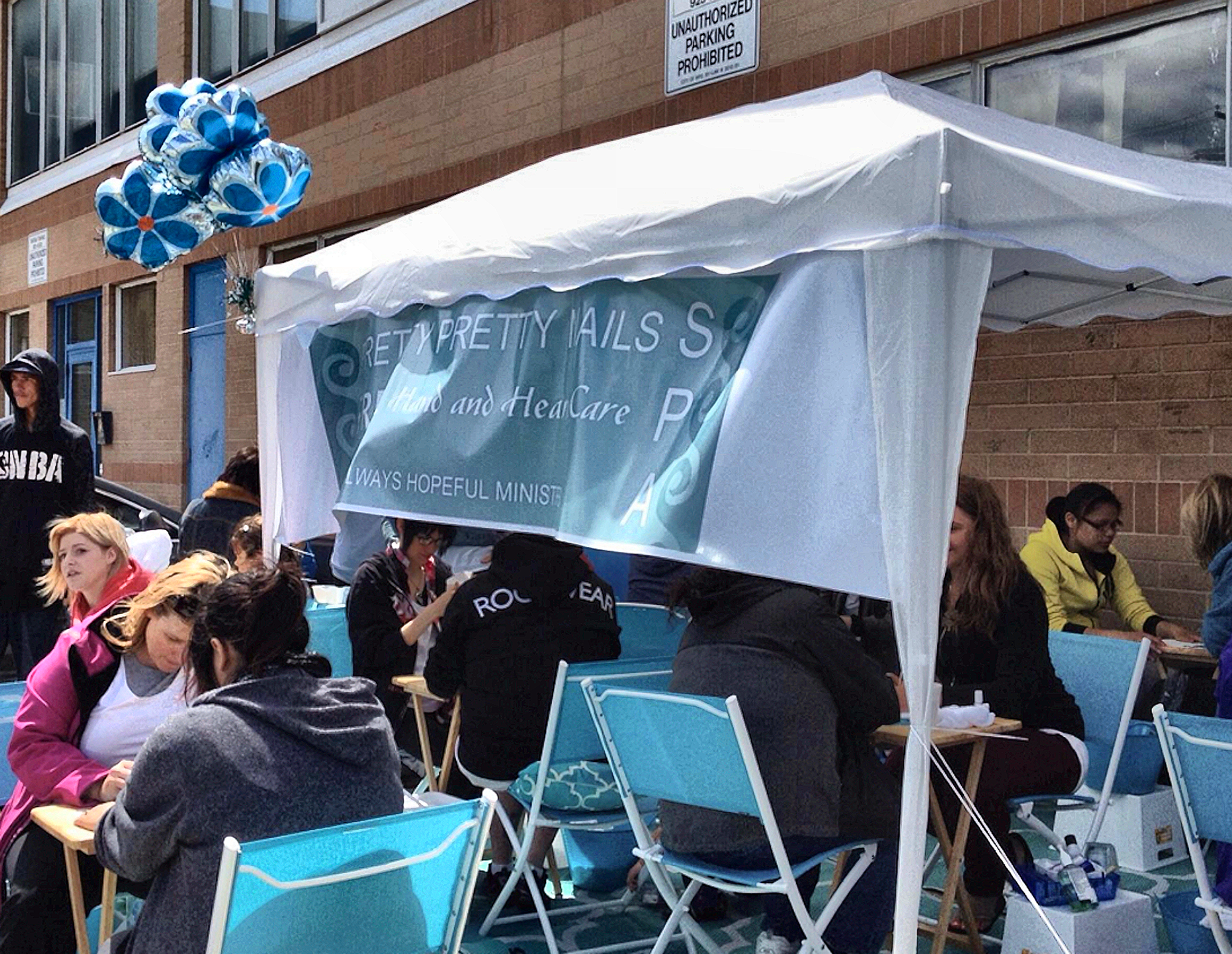 An example of how we have done this is to be a physical and spiritual presence that ministers to communities under God’s direction. For example, in one town we set up a booth with 8 manicure tables and a sign that says “Pretty Nails, hand and heart Spa”. Free manicures. We immediately had a line-up of people who sat down, told us their life stories, and we offered prayer after their manicure.